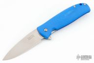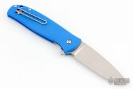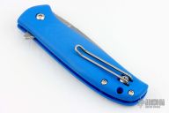 This Skaha By North Arm Knives features a stonewashed drop point blade with notched thumbrest and flipper. The handle has blue G-10 scales with an inlaid stainless steel liner and tip up clip. Rides on bearings, nice detent, lockup and blade seating. Excellent condition.