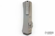 This Glykon by Microtech features a apocalyptic finished double edged blade with fullers and notched thumbrest. The handle has a natural clear aluminum chassis with apocalyptic finished titanium overlays and tip down clip.  Dated 10/2023 and #3976.  Excellent condition. Comes with original box and papers.