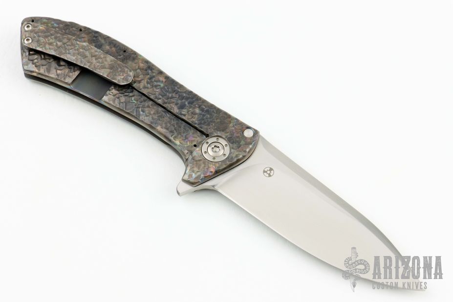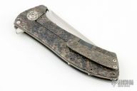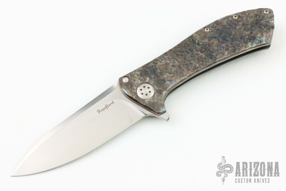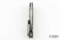 This Singularity by Todd Rexford features a hand rubbed satin finished spear point blade with long swedges, and flipper tab. The handle has hot hammered titanium frame with custom pivot, satin posts, and tip up clip. Nice detent, lockup and blade seating, rides on bearings. Comes in a zipper case. Excellent condition.