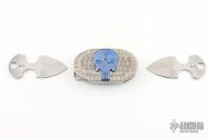 This Prototype Buckle Knife by Reese Weiland features two hand rub satin finished double edged blades, .126" blade stock and 1.699" blade depth, full tang construction. Both knives are hidden in a jeweled stainless steel belt buckle with Timascus punisher skull on the front. Push down on the skull to release the knives from the buckle. NOTE: the knives only go back in one way, so if it feels like they aren't going in, it goes the other way. Comes with a COA dated 9/2021. The buckle itself is marked "PROTO 2019". Has a few light scratches, otherwise excellent condition. One of a kind. Comes with a zippered case. Can accommodate a 1.5" belt.