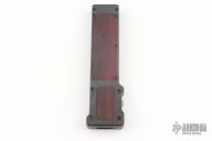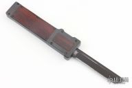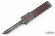 This Gravity Knife Prototype by Ron Miller is dated February 1988. It features a black blade. The handle is blackened steel with rosewood inlays. Marked on handle "Made by Ron Miller FEB 1988 Prototype". This knife has very tight tolerances and takes a sharp flick of the wrist to get it to deploy effectively, it also does not (or maybe no longer) locks in the closed position. Has some scuffs and light scatches, otherwise good condition.