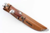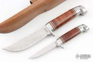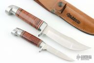 This Set by Western Cutlery features satin finished blades, aluminum guards and butts, stacked leather grip with black/white/red spacers. Comes with original box, papers and brown leather sheath that holds both knives. Excellent condition.