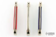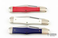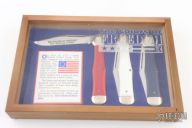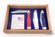This Slipjoint set by Queen Steel features mirror polished clip point blades with nail nicks. The handles have nickel silver bolsters and red/white/blue covers, brass liners and steel backspring. Excellent condition. Comes with original wooden display box.