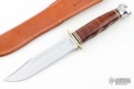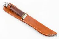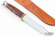 This Ka-Bar Model 1207 has a polished clip pint blade with false top edge and fullers, .122" blade stock and 1.172" blade depth, hidden tang construction. The handle has a brass guard, stacked leatehr grip, aluminum butt, black/white/red spacers. Comes with a brown leather sheath and original box. Excellent condition.