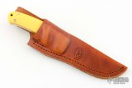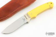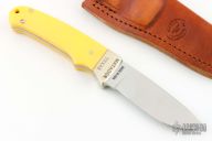 This fixed blade by Moore Maker features a mirror polished blade with .127" blade stock and 1.024" blade depth, full tang construction. The handle has nickel silver bolsters and yellow scales. Coems with original box, papers and brown leather sheath. Excellent condition.