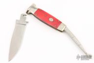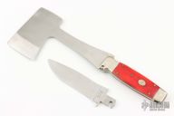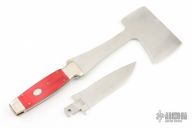 This Axe/Knife combo by Moore Maker features a satin finished frop point blade and a satin finished axe blade that both fit into the same handle. The handle has nickel silver bolsters, red bone scales, brass pins, stainless steel frame. The spine of the handle has a lever that you can lift up to change the blades out. Comes with a brown leather sheath that holds both knives and original box. Has some light scratches, otherwise excellent condition.