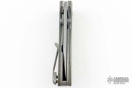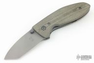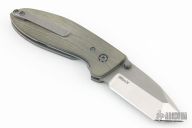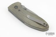 This Alpha framelock by Tom Krein features a stonewash finished chisel ground blade with dual thumbstuds and a false top edge. The handle has green linen micarta scales, tumbled titanium liners and tip up clip, titanium backspacer. Nice lock up, detent and blade seating. Includes a padded case. Excellent condition.