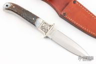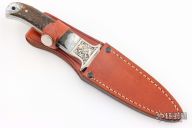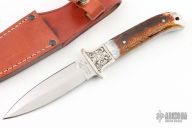This knife by Taylor Cutlery features a satin finished double edged blade with .158" blade stock and .999" blade depth, full tang construction. The handle has engraved nickel silver bolsters, stag jigged bone scales and a lanyard hole. Comes with a brown leather sheath and original box. Excellent condition.