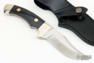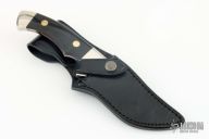 This knife by Frost Cutlery has a satin finished blade with mirror polished flats, .143" blade stock and 1.355" blade depth, full tapered tang construction. The handle has nickel silver bolsters and black linen micarta scales with red liners. Comes with a black leather sheath and original box. Excellent condition.