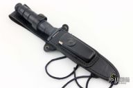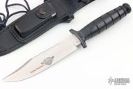 This Harley Davidson Bowie Survival II by Frost Cutlery features a satin finished blade with false top edge and sawteeth on the spine, .197" blade stock and 1.246" blade depth, hollow handle construction. The handle is black aluminum with removable butt cap that holds a compass. Comes with a black leather sheath and original box. Excellent condition.