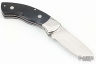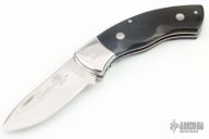 This linerlock folding hunter by Canal Street features a satin polished blade with nail nick. The handle has stainless steel bolsters, black canvas micarta covers with thin red liners, stainless steel liners and backspacer. Excellent condition. Comes with original box, sheath and papers. Excellent condition.