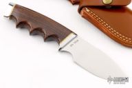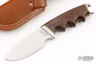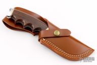 This Model 400 by Gerber Legendary Blades features a polished blade with notched thumbrest, .145" blade stock and 1.481" blade depth, hidden tang construction. The handle has a stainless steel guard and butt with wood grip and brass spacers, has finger grooves. Comes with a brown leather sheath and original box and papers. Excellent condition.