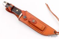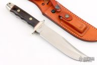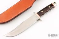 This bowie from A.G. Russell features a satin finished blade with a false top edge, .215" blade stock and 1.531" blade depth, full tang construction. The handle has nickel silver guard and butt, and rosewood scales with red spacers. Comes with original brown leather sheath with belt loop and original box. Excellent condition. Dated 2002