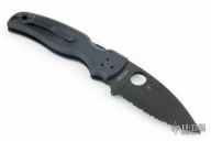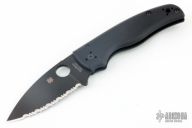 This Shaman Pln by Spyderco features a black fully serrated blade with notched thumb and finger rests, thumbhole. The handle has black G-10 scales, inlaid stainless steel liners and a stonewashed stainless steel backspacer, 4-way reversible stainless steel clip, lanyard hole at the butt. Comes with original box and papers. Excellent condition.