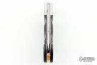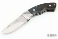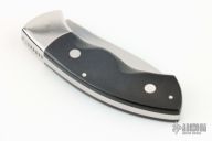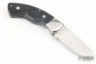 This linerlock folding hunter by Canal Street features a satin polished blade with nail nick. The handle has stainless steel bolsters, black canvas micarta covers with thin red liners, stainless steel liners and backspacer. Excellent condition. Comes with original box, sheath and papers. Excellent condition.