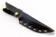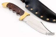 This Razorback from Rigid Knives features an upswept satin finish blade with a false top edge, .176" blade stock and 1.795" blade depth, full tang construction. The handle is comprised of brass guard and pommel with rosewood scales. Includes black leather sheath, original box and papers. Excellent condition.