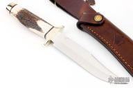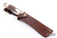 This Scout by Puma features a satin finished blade with false top edge and hidden tang construction, .161" blade stock and 1.249" blade depth.  The handle has a nickel silver guard and  butt with a stag grip and black spacers. Includes original box and brown leather sheath. Excellent condition.