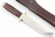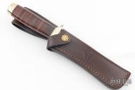 This Scout by Puma features a satin finished blade with false top edge and hidden tang construction, .168" blade stock and 1.255" blade depth.  The handle has a nickel silver guard and butt with a stacked leather grip. Includes original box and brown leather sheath. Excellent condition.