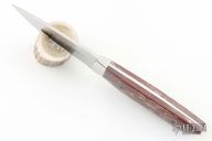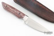 This knife by Tinus Beukes features a hand rub satin finished drop point blade with .145" blade stock and 1.186" blade depth, full tapered tang construction. The handle has mirror polished stainless steel bolsters, giraffe bone scales. Comes with a brown leather sheath with ostrich leg skin overlay. New from maker!