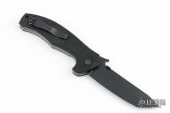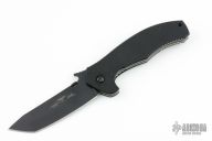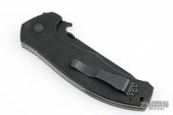 This Super Roadhouse features a black tanto blade with thumbdisc, notched thumbrest and wave feature. Handle scales are textured black G10 with titanium liners. Black stainless steel clip. Comes with original box. Excellent condition. Dated 2012 #047