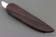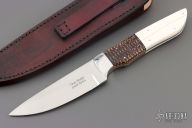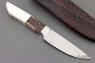 This knife by Tinus Beukes features a hand rub satin finished drop point blade with .145" blade stock and 1.195" blade depth, full tapered tang construction. The handle has mirror polished stainless steel bolsters, stabilized corn cob and warthog tusk scales. One of the scales has a crack in it that has been stabilized. Comes with a brown leather sheath with ostrich leg skin overlay. New from maker!