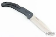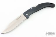 This vintage Extra Large Voyager by Cold Steel features a clip point blade with single thumbstud, and full serrations. The handle has a black Zytel frame with stainless rockerbar, lanyard hole, and Zytel tip up clip. Comes with original box. Has a couple light scuffs, excellent condition otherwise.