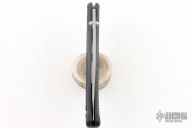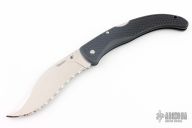 The Vaquero Series folders all feature our distinctive “S-Curve” clip point blade style. They are precision flat ground to form a long, shallow “V” shaped cross section. This is ideal for shearing through thick, fibrous materials such as manila rope, cable, hose, belts, etc. The serrated edges form a sinuous double curve. This means that whatever material is struck with the inward curving portion of the edge (near the hand) will automatically force the remaining curved edge entirely through.