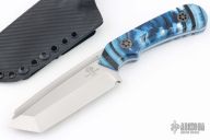 This Warrior by Beans Blades features a satin finished blade with fullers, .159" blade stock and 1.604" blade depth, full tang construction. The handle has dyed and stabilized cross cut mammoth ivory scales with blue G-10 liners and zirconium screws. Comes with a kydex sheath with clip. Excellent condition. #010