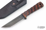 This Pocket Tanto by Primitive Woodsman features a black oxide finished blade with fullers, .128" blade stock and .931" blade depth, full tang construction with sculpted curly maple scales. Comes with a black leather sheath with Ulti-clip. Excellent condition.