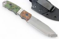 This Disaster Jr by Half Face Blades features a cerakoted drop point blade with a full tang construction, .154" blade stock and 1.221" blade depth, textured blade spine and tang. The handle has black ash burl, white trustone and dyed maple burl scales. Comes with a kydex sheath and a brown leather sheath. Excellent Condition.