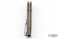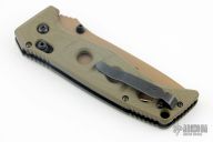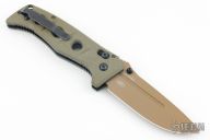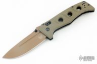 This Adamas by Benchmade is a Shane Sibert design, it has a brown blade with dual thumbstuds, fullers and notched thumbrest. The handle has green G-10 scales, black stainless steel liners and tip up clip. Nice lockup and blade seating. Comes with original box and sheath. Excellent condition.