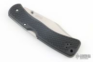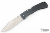 This Voyager by Cold Steel features a satin finished fully serrated clip point blade with dual thumbstuds. The handle has a black FRN frame with tip up clip and lanyard hole. Japan Made. Comes with original clip (not currently attached). Has some spotting on the blade, and some light scuffs and scratches, great condition otherwise.