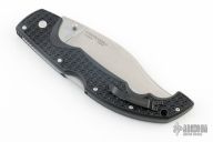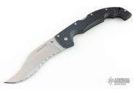 This Extra Large Voyager by Cold Steel features a satin finished fully serrated recurve clip point blade with dual thumbstuds. The handle has a black FRN frame with tip up clip and lanyard hole. Taiwan Made. Comes with original box.. Has a couple light scuffs, excellent condition otherwise.