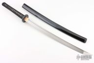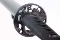 This Chisa Katana by Cold Steel features a hand rub satin finished blade with fullers, .326" blade stock and 1.369" blade depth, hidden tang construction. It has genuine Same (Rayskin) on the Tsuka, with a wrap (Tsuka-Ito). The long tang is double-pegged for security. The fittings are decorated in a Japanese Dragon motif with dragon menuki, and the handsome Tsuba is of an iron dragon design with a brass habaki. Comes with a matching black Saya. Excellent condition.