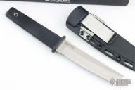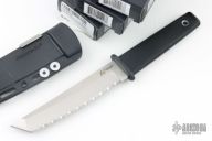 This Serrated Kobun by Cold Steel features a satin finished tanto blade, .129" blade stock and 1.043" blade depth, hidden tang construction. The has checkered rubber grip and guard, with lanyard hole. Comes with molded sheath with belt clip, and original box. Lot of 3, Excellent condition.