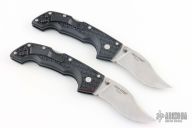 This Medium Voyager by Cold Steel features a satin finished fully serrated recurve clip point blade with dual thumbstuds. The handle has a black FRN frame with tip up clip and lanyard hole. Taiwan Made. Comes with original clip (not currently attached) and boxes. Lot of two, Excellent condition.