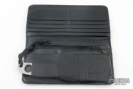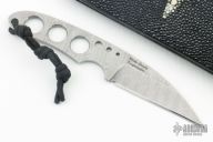 A fixed blade by Mike Snody features a Damasteel chisel ground blade with notched thumbrest, .140" blade stock and 1.183" blade depth full tang construction. The handle has the kydex sheath that is attached to an Infinity Leatherworks Rayskin wallet. Excellent Condition.