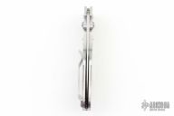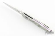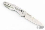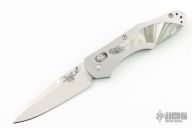 This axis lock folder by Benchmade is a Warren Osborne design, it features a drop point tumble finished blade with dual thumb studs. Satin finished stainless steel frame with pearlex inlays with 2 ball bearings, purple aluminum backspacer, stainless steel tip up clip, left or right reversible. Has some light scratches, otherwise excellent condition. Limited Edition #209 of 500.