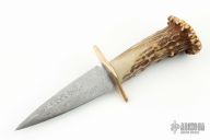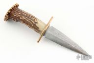 This dagger from Bill Buchner features a Damascus double edge blade with .084" blade stock and .782" blade depth, hidden tang construction. The handle has brass guard, and stag grip. Has a couple light scuffs, excellent condition otherwise. Marked 3-79 on the guard. Consignor denotes, he was told this is the first Damascus knife Bill made. Has some light scuffs, excellent condition.