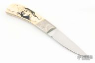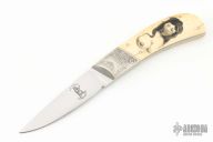 This knife by Russel Easler features a hand rub satin finished blade, .125" blade stock, .823" blade depth, full tang construction. The handle has engraved nickel silver bolsters, engraving done by "marked SML 83" under the bolster, the handle has scrimshaw handle marked "TM". Scales have shrunk, and some cracks near the pins, excellent condition otherwise.