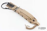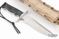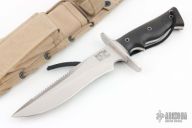 This Model 2-7 by Walter Brend features a double hollow ground blade with hand rub satin finish, , and a 4.25" sharpened and serrated top edge, .209" blade stock and 1.627" blade depth, full tang construction. The handle has a satin finished titanium double guard, and black canvas micarta scales, hollow tube pins and lanyard hole. Comes with a nylon sheath with a Leatherman Signal in the auxilary pouch. Has some light scratches, otherwise excellent condition.