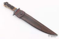 Another absolutely stunning piece from the Sobral brothers! This Dog Bone Bowie features a San Mai Damascus blade with false top edge, .282" blade stock and 1.883" blade depth, hidden tang construction. The handle has a fileworked blued steel guard with a fileworked stainless steel spacer, fluted blued steel spacer with fileworked stainless steel spacer, beautiful stag scales, fileworked blued and stainless steel frame, blued steel tang nut, domed pins. This piece comes in an equally impressive, hand tooled, brown leather sheath with snakeskin inlay. Excellent condition. Comes with COA and cloth pouch.