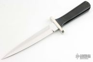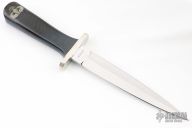 This Dagger by Wayne Hensley features a mirror finished double edge blade with .245" blade stock and 1.019" blade depth, hidden tang construction. Thehandle has a nickel silver guard, micarta grip with inlay at the butt. Has some light scuffs and scratches, excellent condition otherwise.