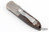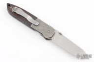 This "Garage Period" CQC-6 by Ernie Emerson has a satin finished chisel ground tanto blade with notched thumbrest, thumbdisc, and heavy buffing line. Handle has green canvas micarta scales with bead blasted and dovetailed and threaded titanium bolsters, over bead blasted titanium liners, stainless steel tip up clip, black G-10 backspacer, and lanyard hole. Nice detent, lockup and blade seating. Has some scuffs and scratches, has been used and carried, otherwise good condition for its age. This one has #5 on the underside of the scales and liners. Comes with a zippered case.