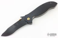 This Order of the Black Shamrock by Emerson knives is #1059, it features a black blade with notched thumbrest, upgraded anodized titanium Shamrock thumbdisc and wave feature. The handle has black G-10 scales, titanium liners, upgraded anodized titanium standoffs and pivot, tip up black stainless steel clip. Comes with original box and papers. Excellent condition. #1059