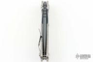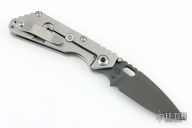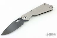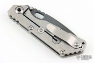 This Mick Strider Performance series SNG framelock folder features a black drop point blade with thumbhole and notched thumbrest. The handle has a stonewashed titanium frame with titanium deep carry clip, tip up carry. Jimping on blade spine. Includes Hinderer "Lock Bar Stabilizer" for maximum reverse lock retention. Excellent lockup, detent, and blade seating. New Condition.