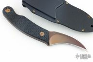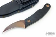 This Elvia by Turner CNC features an "HT" finished hawkbill blade, .153" blade stock and 1.205" blade depth with full tang construction. The handle has a milled black g10 scales with bronzed hardware.  Comes with a kydex sheath and the knife will fit in either direction, original box, and COA. 63HRC. Excellent condition.
