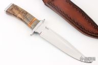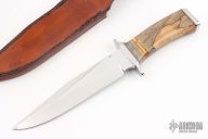 This Bowie from George Cousino features a polished clip point blade with false top edge. The handle is comprised of a stainless double guard with black, nickel silver and wood spacer and bone handle with stainless pommel over hidden tang construction. Comes with hand tooled leather sheath. Some light marks on blade and guard, excellent condition otherwise.