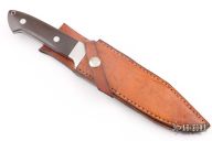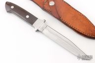 This Large Chute Knife from Randall Gilbreath features a satin finish blade with a sharpened top edge, .243" blade stock and 1.069" blade depth, full tapered tang construction. The handle has satin finished stainless steel bolsters and pins with brown linen micarta scales. Lanyard tube with lanyard in pommel. Includes a brown leather sheath. Excellent condition.
