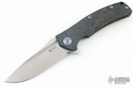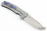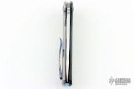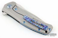 This Horizon D from Reate Knives features a tumble finished blade with fuller, notched thumbrest and flipper. The handle has a bead blasted and milled titanium frame with carbon fiber scale. Pivot and tip up pocket clip have been anodized for a faux mokuti appearance, all other hardware and backspacer have been anodized blue. Nice detent, lockup and blade seating. Excellent condition. Comes with original box and zippered case. Cranes Production Exclusive